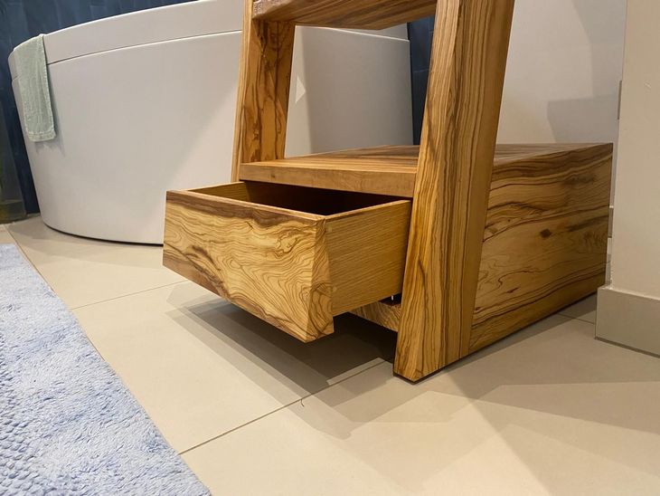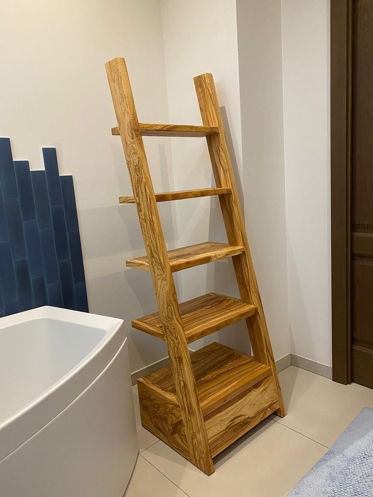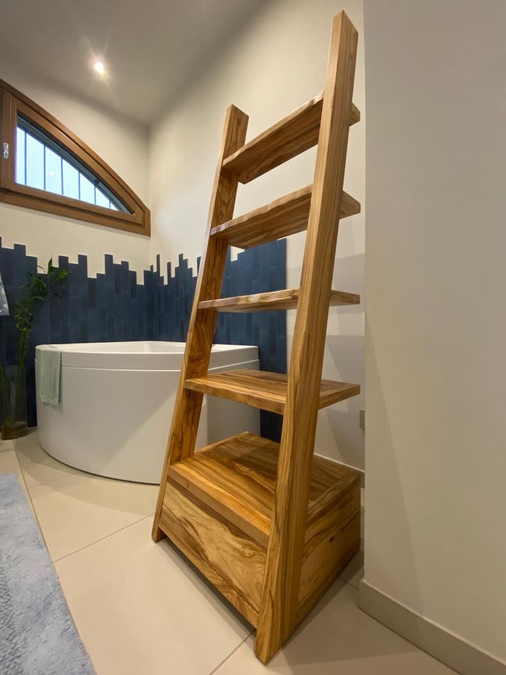 Mobile bagno a forma di scaletta porta asciugamani e accessori. In legno di ulivo con cassetto premi e apri.